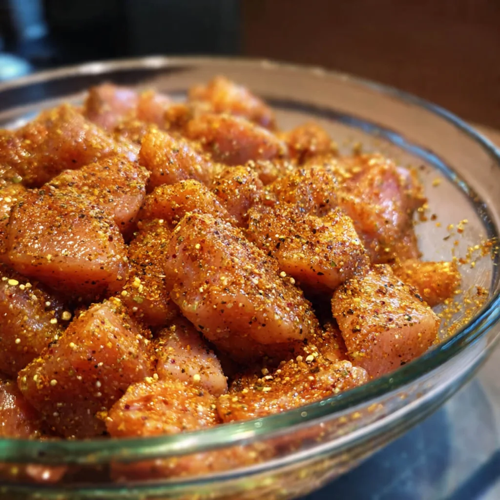 2. Toss chicken cubes with vegetable oil garlic powder smoked paprika salt and pepper.