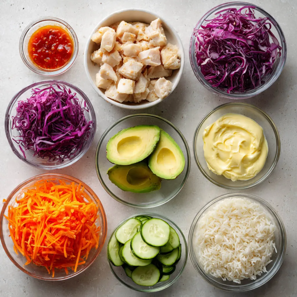 A bang bang chicken burrito bowl includes seasoned chicken, creamy bang bang sauce, rice, crunchy vegetables like cabbage and carrots, and fresh toppings such as avocado and cilantro. It’s balanced, colorful, and full of flavor.