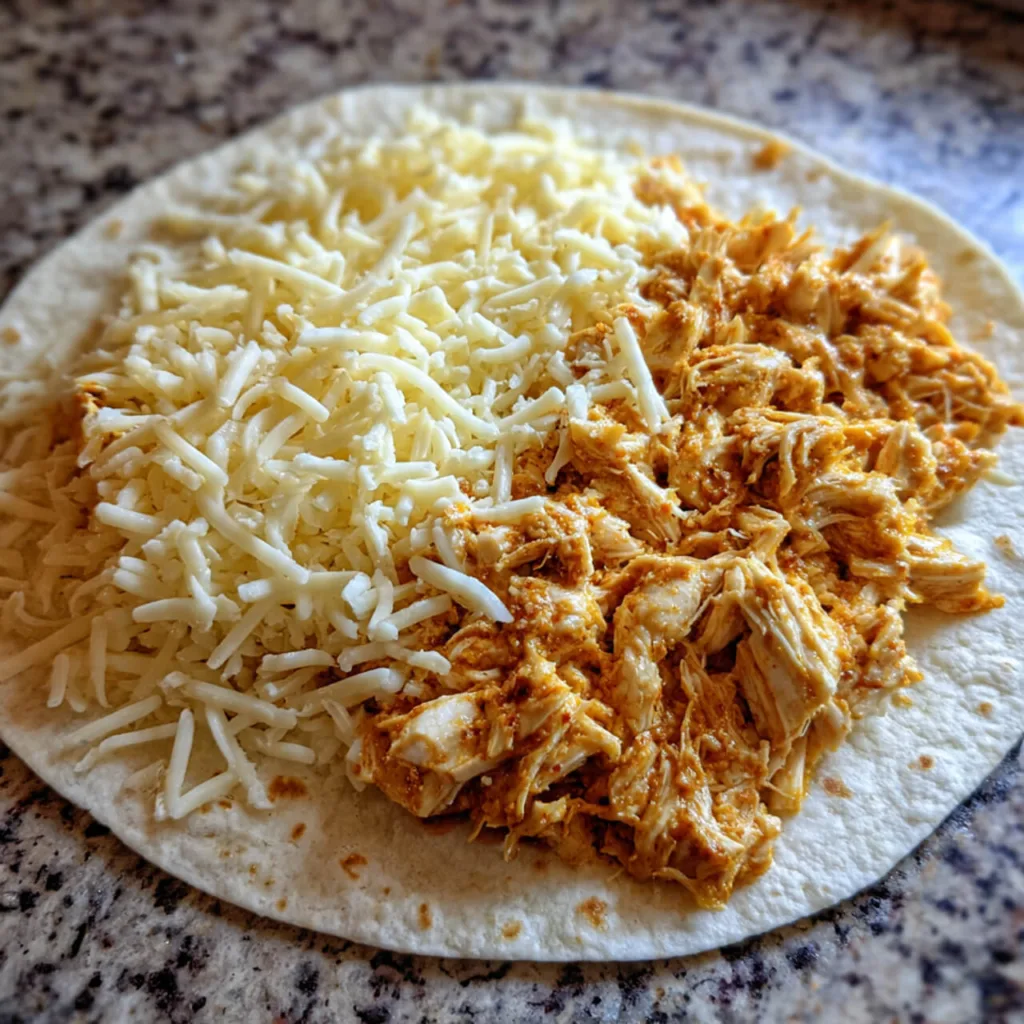 Lay one tortilla flat. Sprinkle ¼ cup Monterey Jack and ¼ cup cheddar over half of the tortilla. Spread about ¾ cup buffalo chicken mixture evenly over the cheese. Add another light sprinkle of cheese on top, then fold the tortilla in half.
