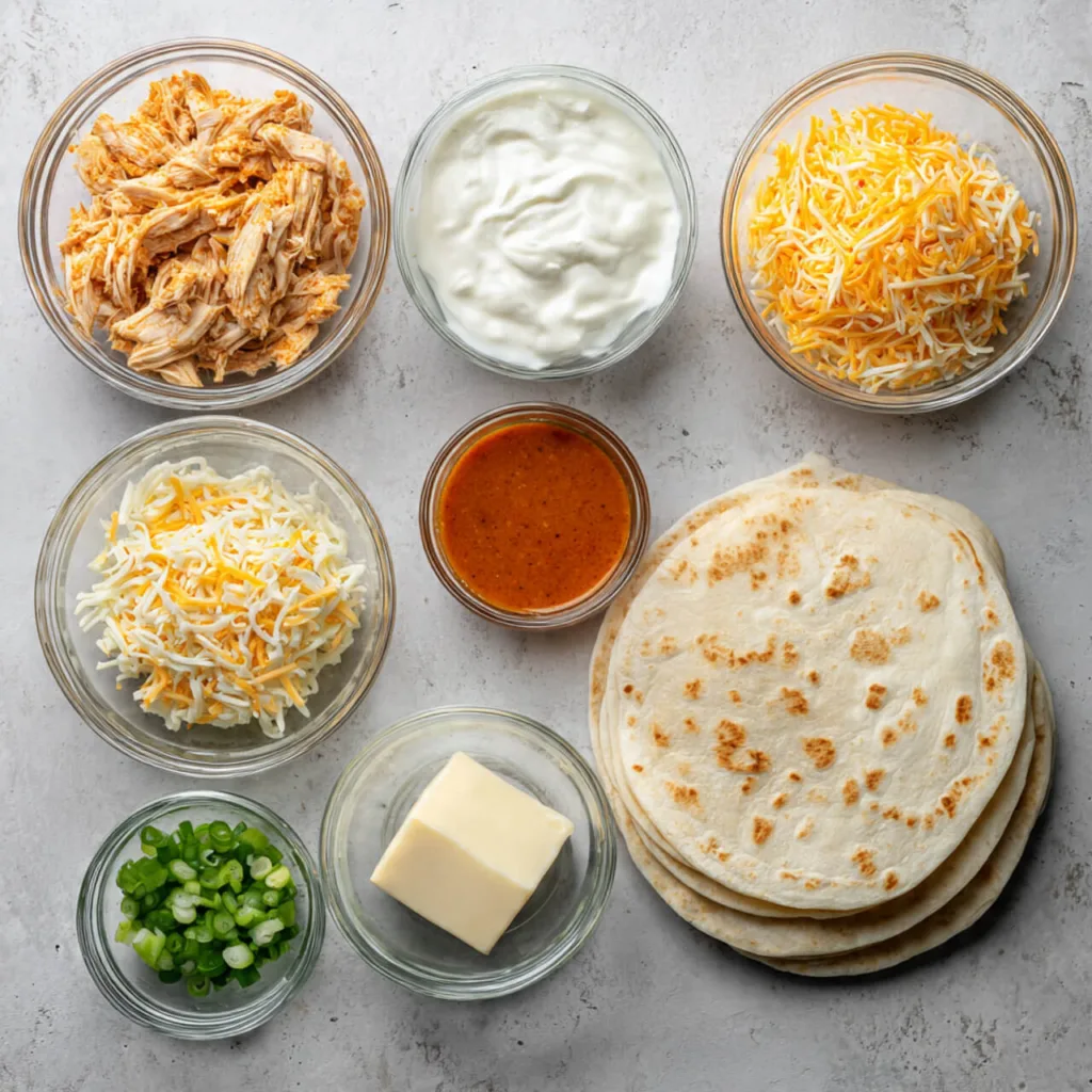 Ingredients for Buffalo Chicken Quesadillas with Ranch Sauce