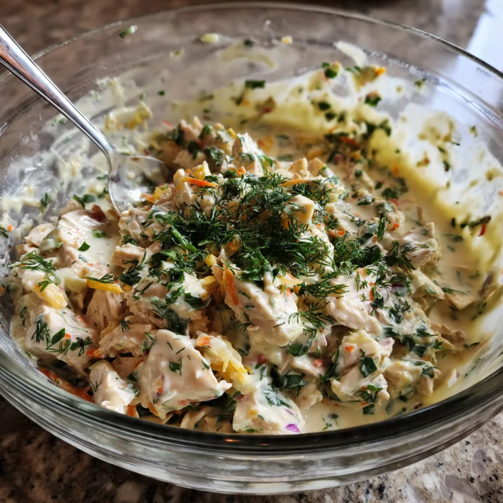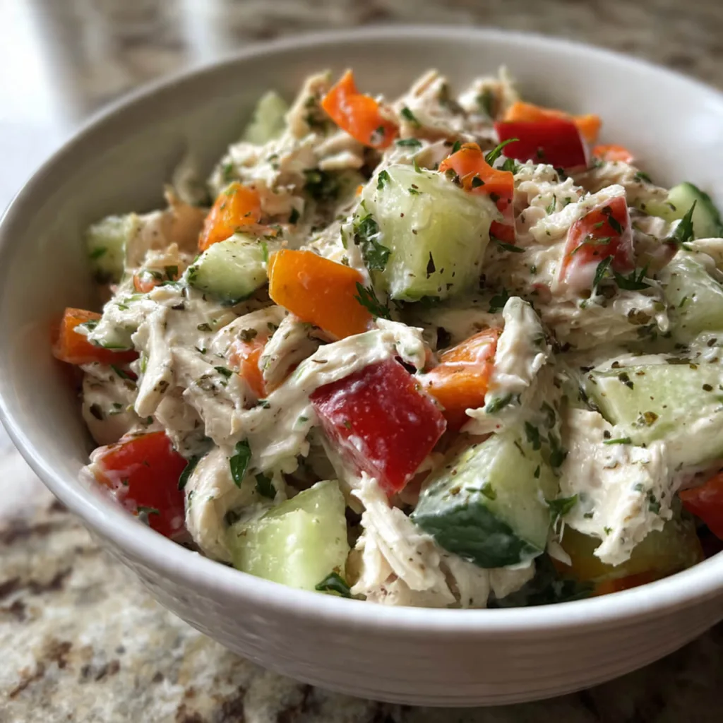 Creamy Garlic Herb Chicken Salad mixes tender chicken with a creamy dressing, garlic, and fresh herbs for a rich yet fresh flavor. The dressing coats the chicken evenly while garlic and herbs add aroma and depth.