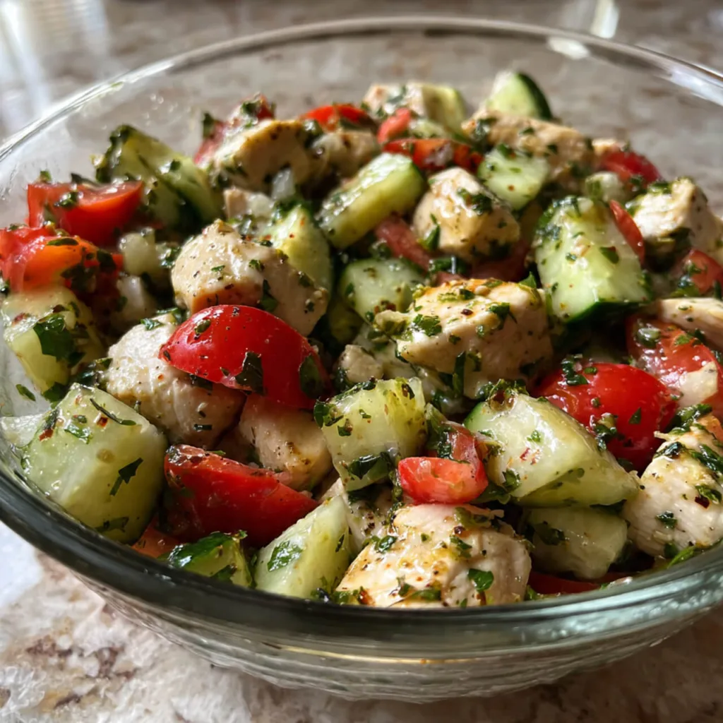 Creamy Mediterranean Chicken Salad combines tender chicken, crisp cucumber, juicy cherry tomatoes, fresh herbs, feta cheese, and a creamy Greek yogurt dressing. The salad delivers a refreshing Mediterranean flavor with a smooth creamy texture and bright herb aroma. It works well for light lunches, wraps, pita sandwiches, or simple grain bowls.