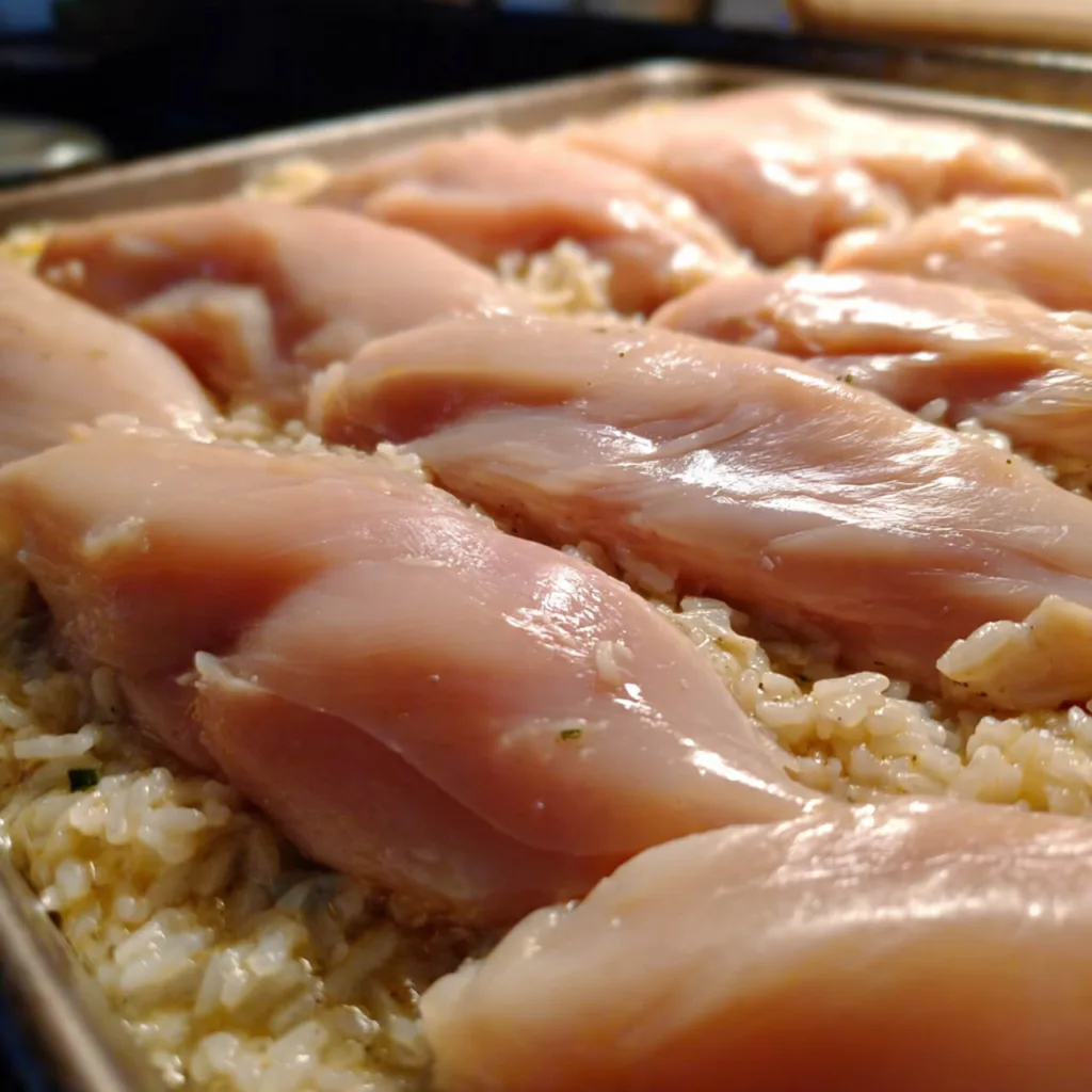 - Place raw chicken on top of rice mixture. Season chicken with remaining salt and pepper. Layer sliced mushrooms over the chicken.