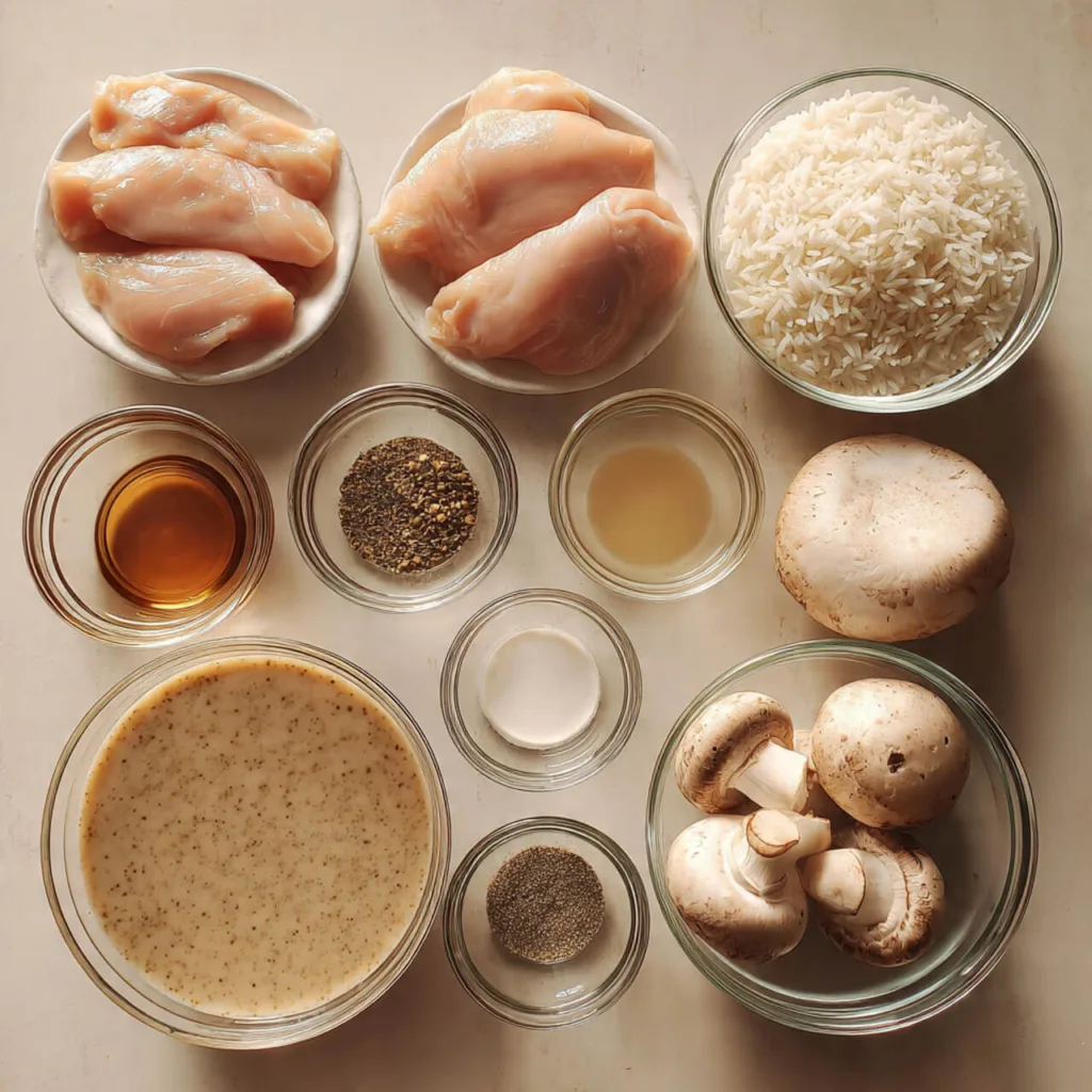 Ingredients for Creamy Mushroom Smothered Chicken with Rice