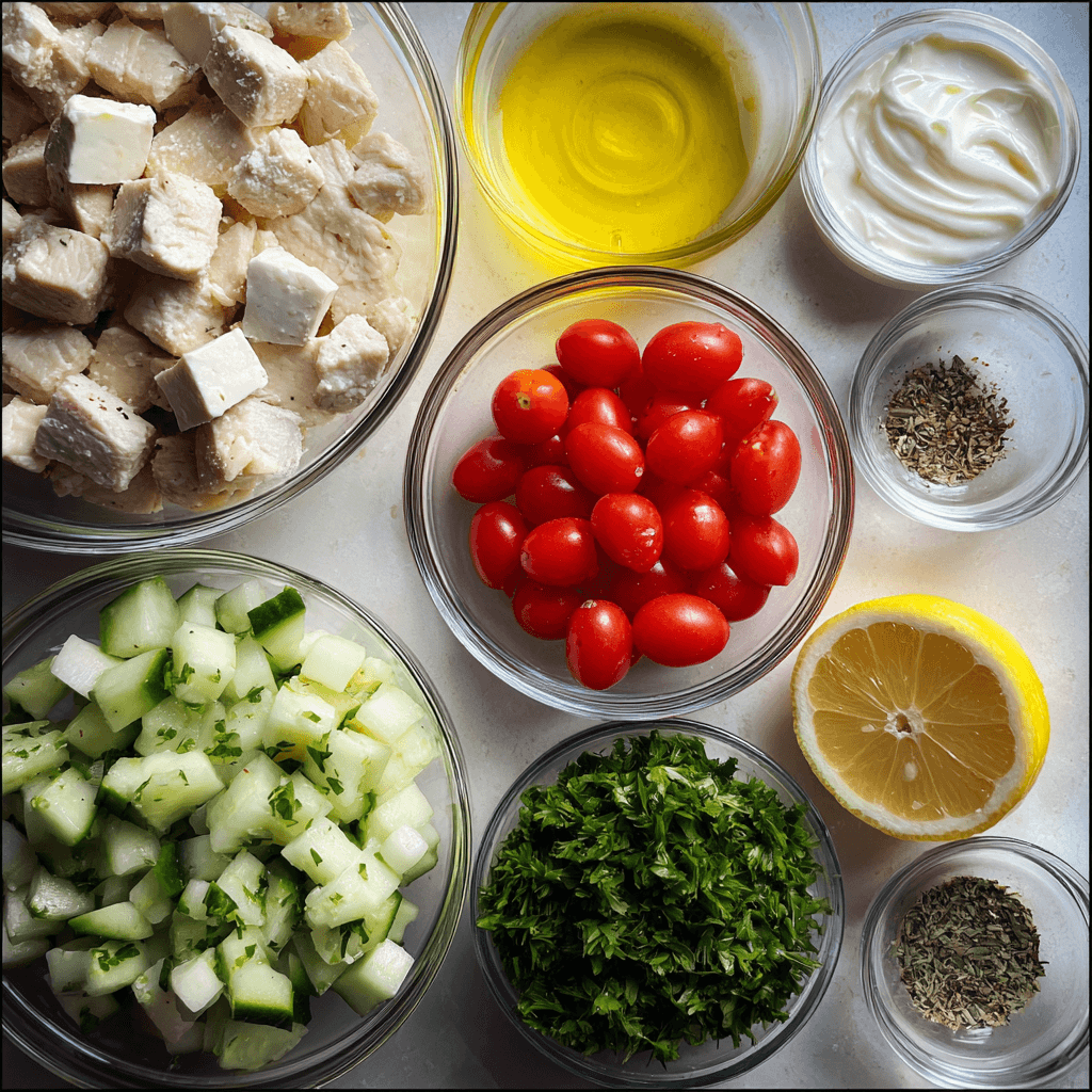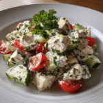 A fresh and creamy feta chicken salad with tender chicken, crisp vegetables, and a tangy lemon herb dressing. Light, balanced, and perfect for everyday meals.