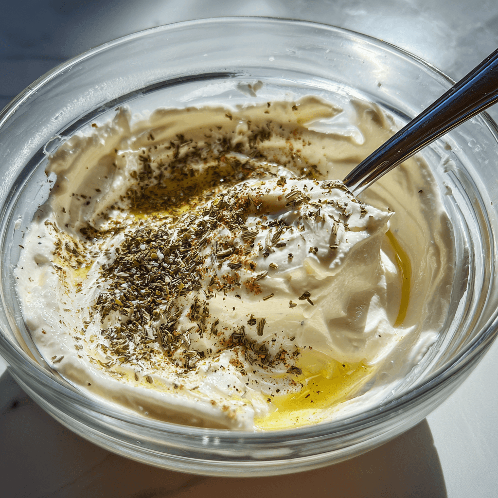 3. In a large mixing bowl, combine the Greek yogurt, olive oil, lemon juice, dried oregano, salt, and black pepper. Stir continuously for about 1 to 2 minutes until the dressing becomes smooth, creamy, and slightly glossy with no lumps remaining.