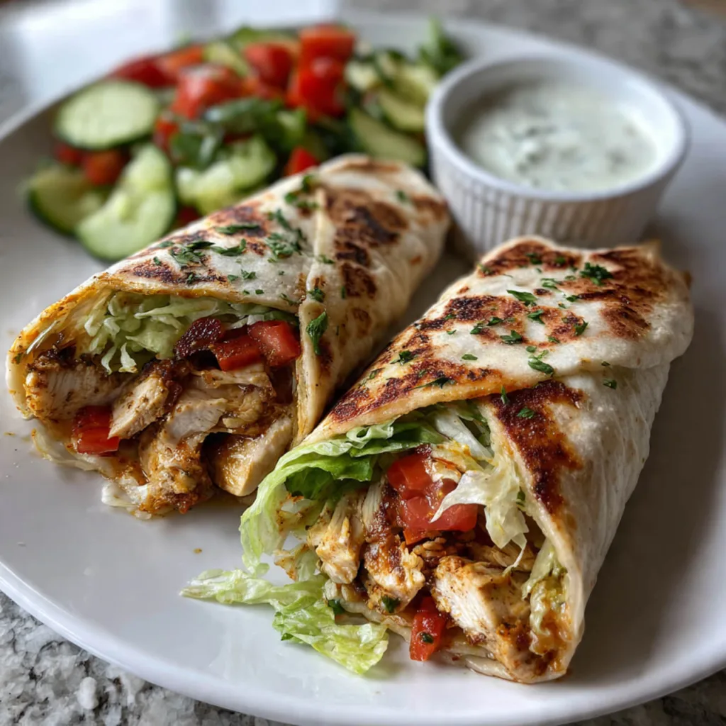 Garlic Butter Chicken Flatbread Wraps are juicy, flavorful, and perfect for easy lunch ideas chicken meals or dinner recipes chicken healthy nights. Tender garlic butter chicken pairs with crisp vegetables and a creamy spicy yogurt sauce wrapped in soft flatbread.