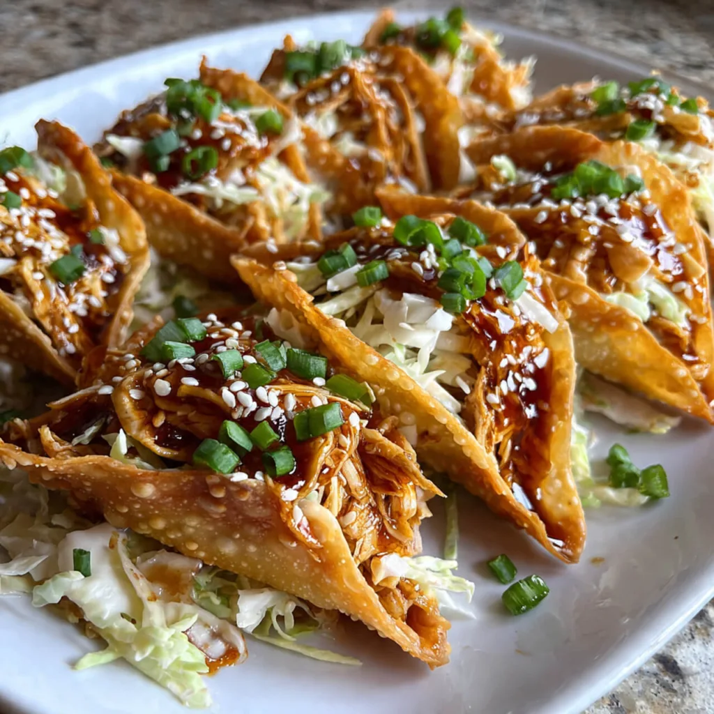 I first came across these tacos at a neighborhood block party. Someone had made a big platter of crispy little shells filled with shredded chicken and slaw, and they disappeared almost as fast as they hit the table. I’d never seen wonton wrappers used like that before, and the flavor had that perfect sweet and savory combo I couldn’t stop thinking about. I went home and started experimenting the very next weekend.
