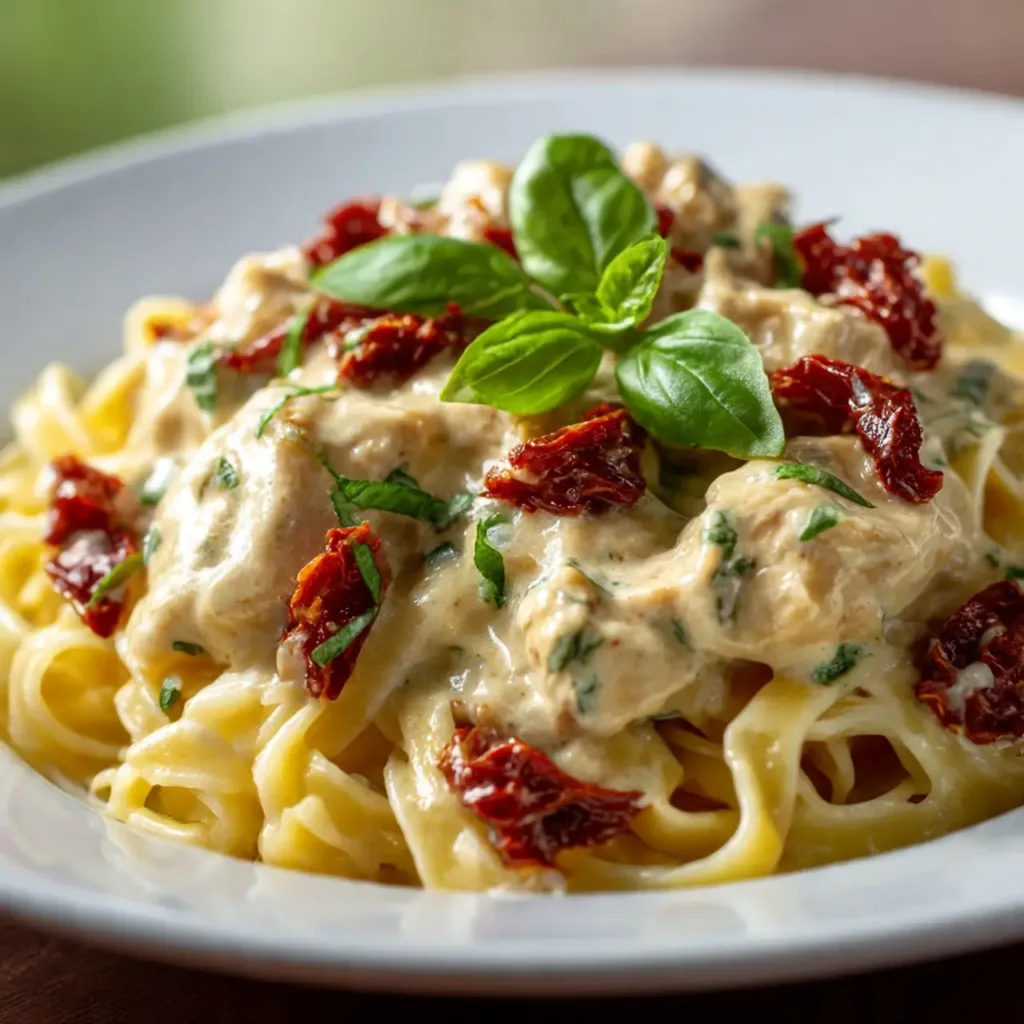 Spoon the chicken and sauce over al dente fettuccine or penne. The creamy sun-dried tomato sauce clings to pasta like a dream.