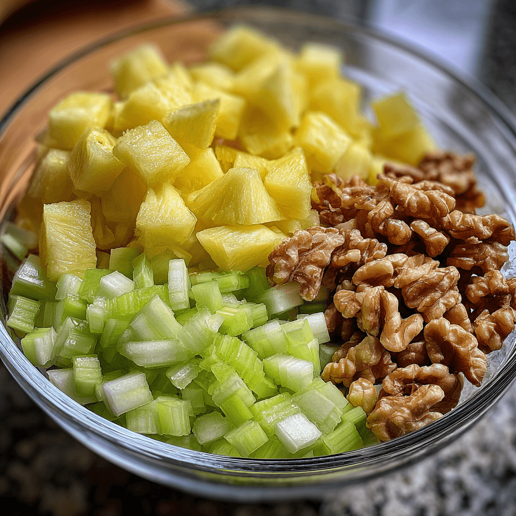 Dice the pineapple into small cubes and chop the celery and walnuts. Keeping everything similar in size helps the texture stay balanced.