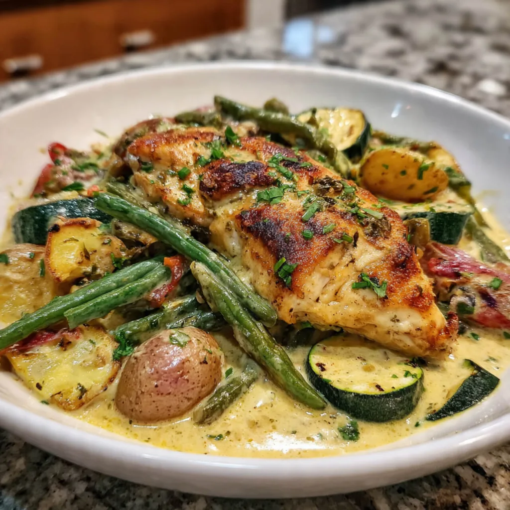 Place the sheet pan in the oven and bake for 20 to 25 minutes. The chicken should be fully cooked and slightly golden, while the vegetables turn soft with lightly crisp edges.