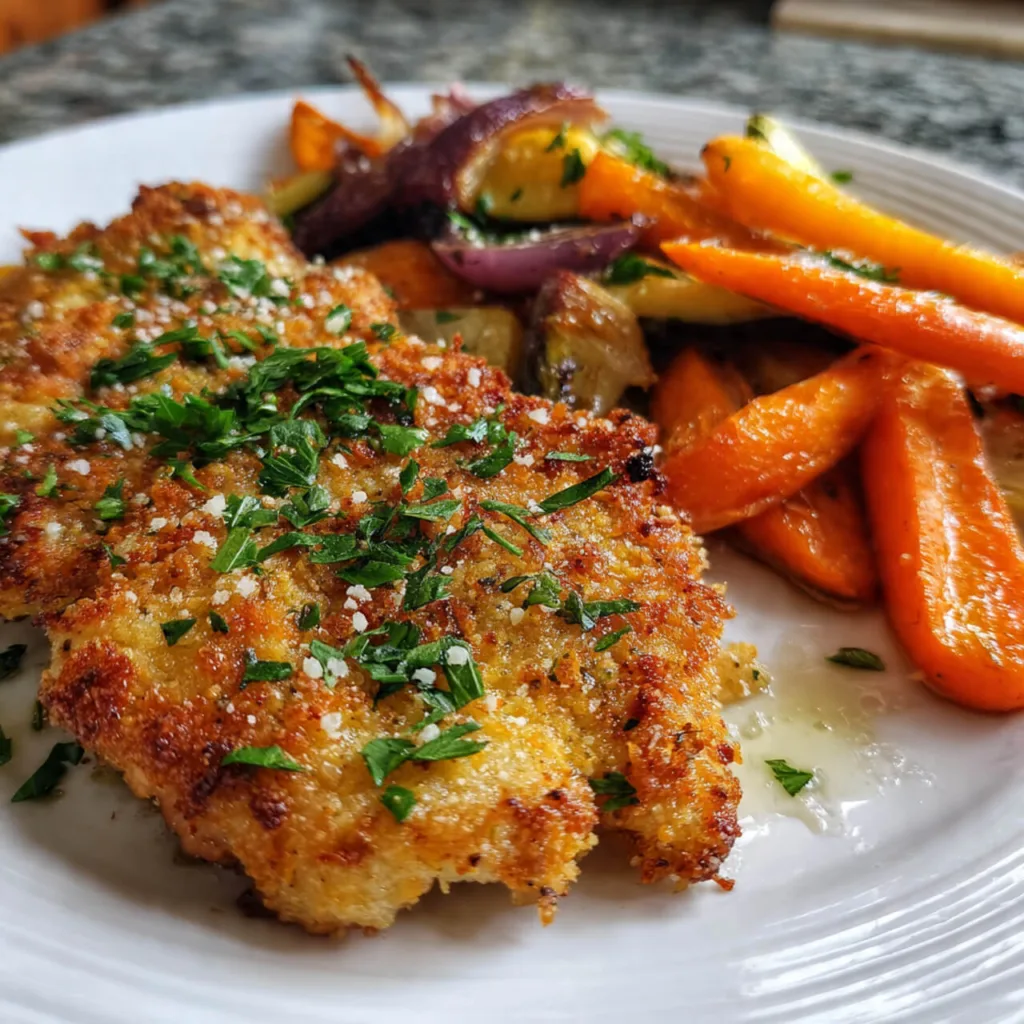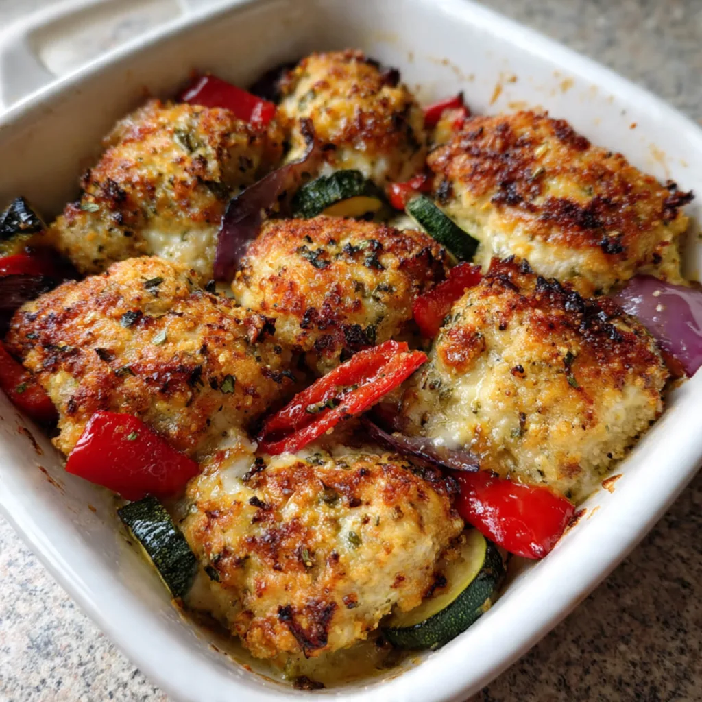 This chicken dish is coated in a savory parmesan and breadcrumb crust, paired with a colorful mix of roasted vegetables. It’s a full dinner built on one pan, and it only takes about 15 minutes to prep. As it bakes, the aroma of garlic, herbs, and cheese fills the kitchen, making everyone look forward to dinnertime.