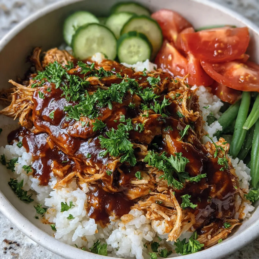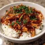 The chicken cooks low and slow in a rich blend of barbecue sauce and honey, creating tender, juicy bites that shred effortlessly with a fork. As the sauce thickens, it coats every piece of chicken in sweet and smoky flavor. When you stir it into fluffy rice, you get a balanced bbq chicken rice bowl that works for both summer dinner meals and cozy evenings at home.