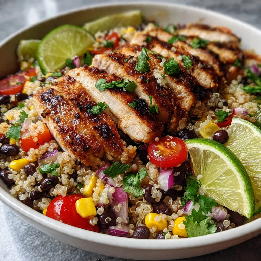 With tender chicken, fluffy quinoa, fresh vegetables, and bright lime dressing, this bowl delivers texture and freshness without heaviness.