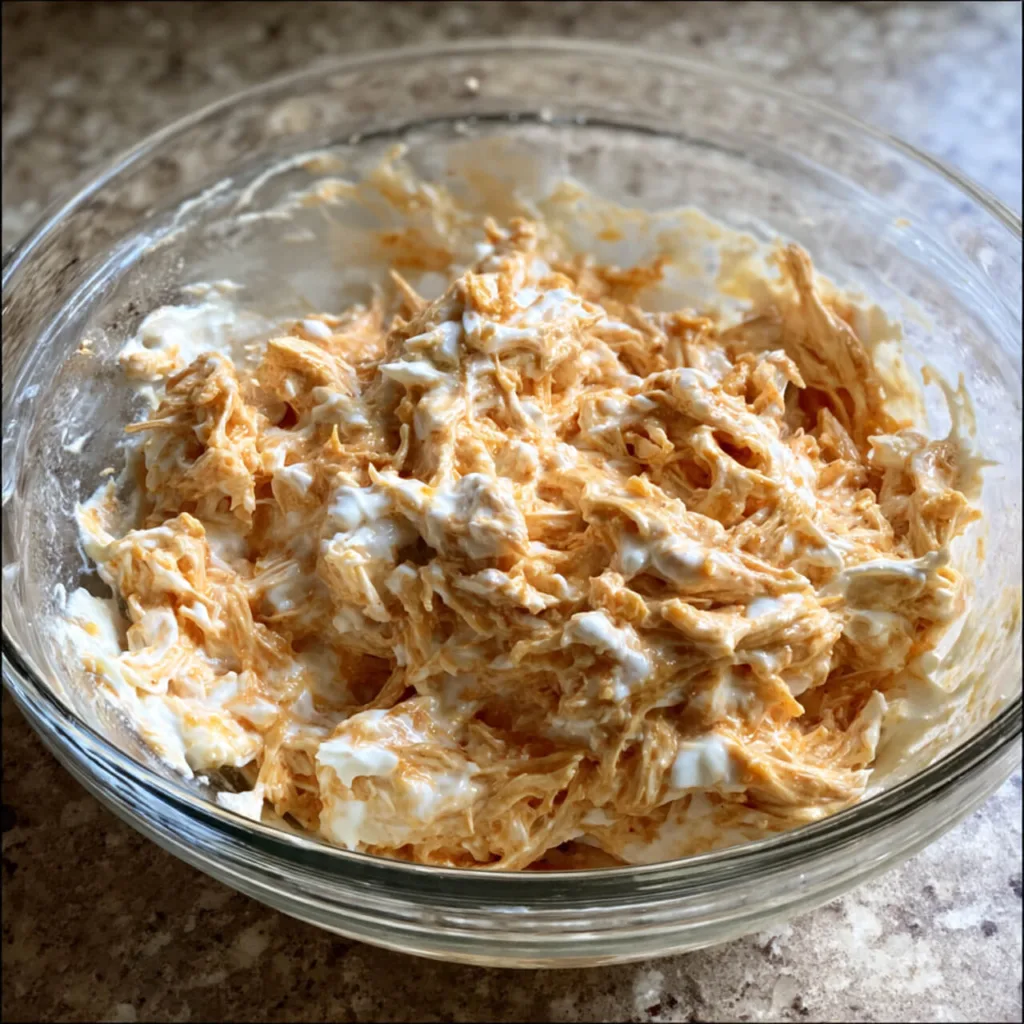 1. In a bowl, mix shredded chicken, buffalo sauce, ranch dressing, and softened cream cheese until combined.