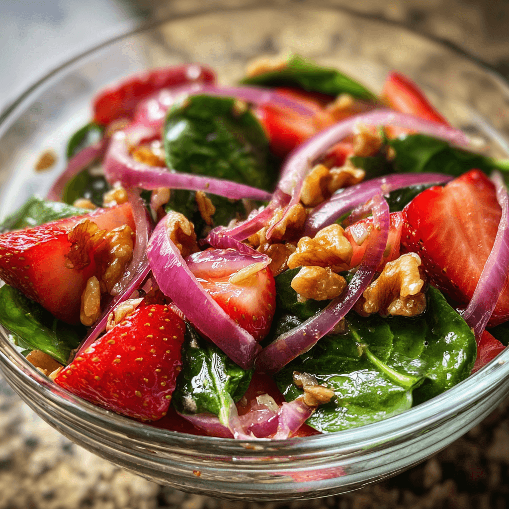 Slice the strawberries, thinly cut the red onion, and rinse the spinach well. Let the greens dry completely so the salad doesn’t become watery.