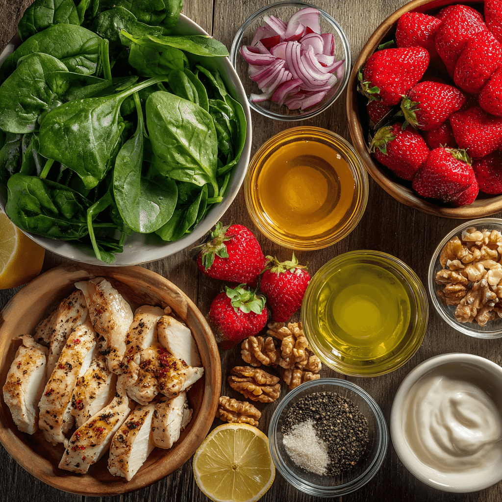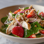 Strawberry chicken salad made with tender chicken, fresh spinach, juicy strawberries, and crunchy walnuts in a light creamy dressing. This fresh and vibrant recipe is perfect for summer meals and light lunches.
