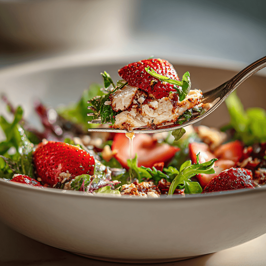 Fresh ingredients really shine here. Each bite carries a mix of textures that keeps things interesting. Soft chicken, crisp greens, and juicy strawberries create contrast without feeling heavy. The dressing ties everything together gently, allowing the natural flavors to stand out instead of getting covered up.
