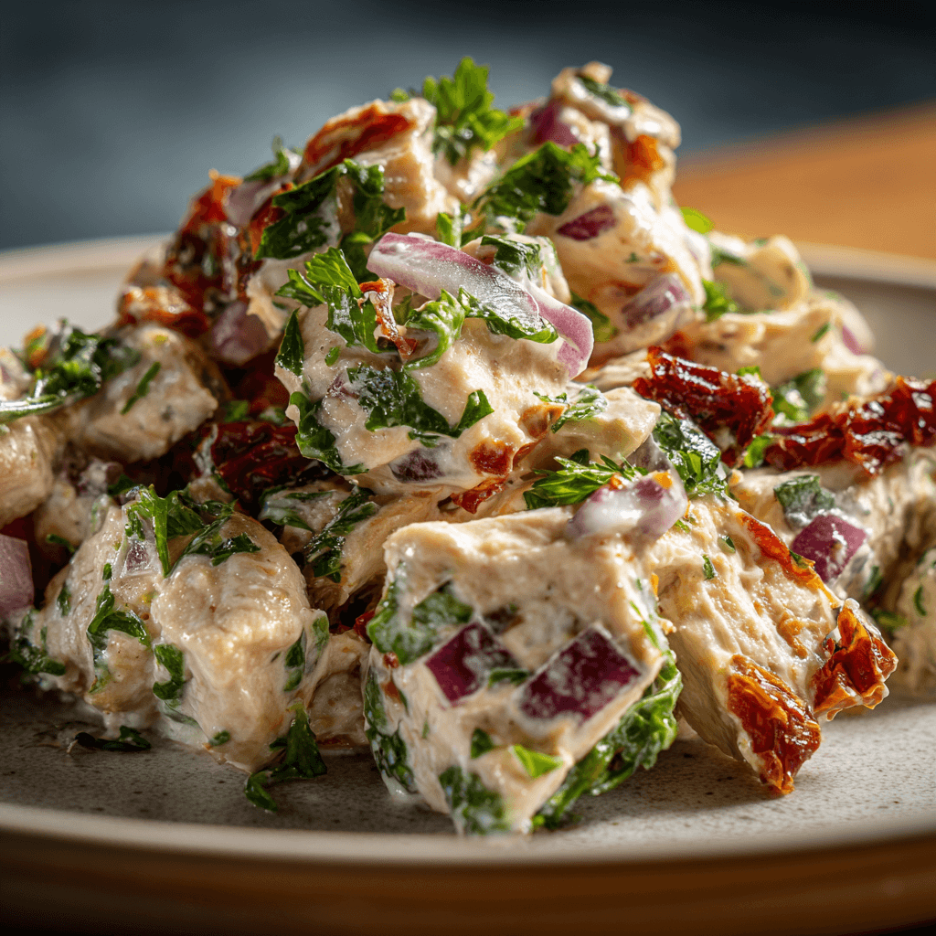 A creamy, tangy sun-dried tomato chicken salad made with tender chicken, rich tomatoes, and fresh herbs. Perfect for quick lunches, wraps, or light dinners.