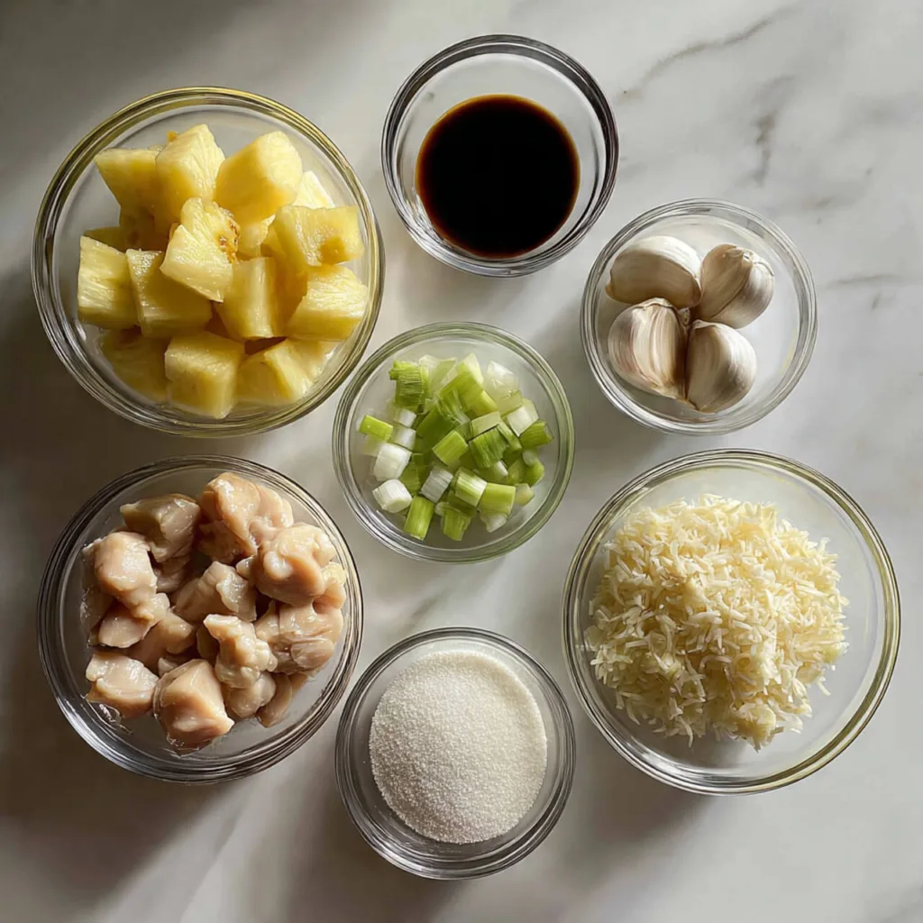 To make this flavorful pineapple chicken dinner, you’ll need fresh ingredients with bold flavor. Each one plays a role in building a sauce that clings to the chicken perfectly and sits beautifully over rice.