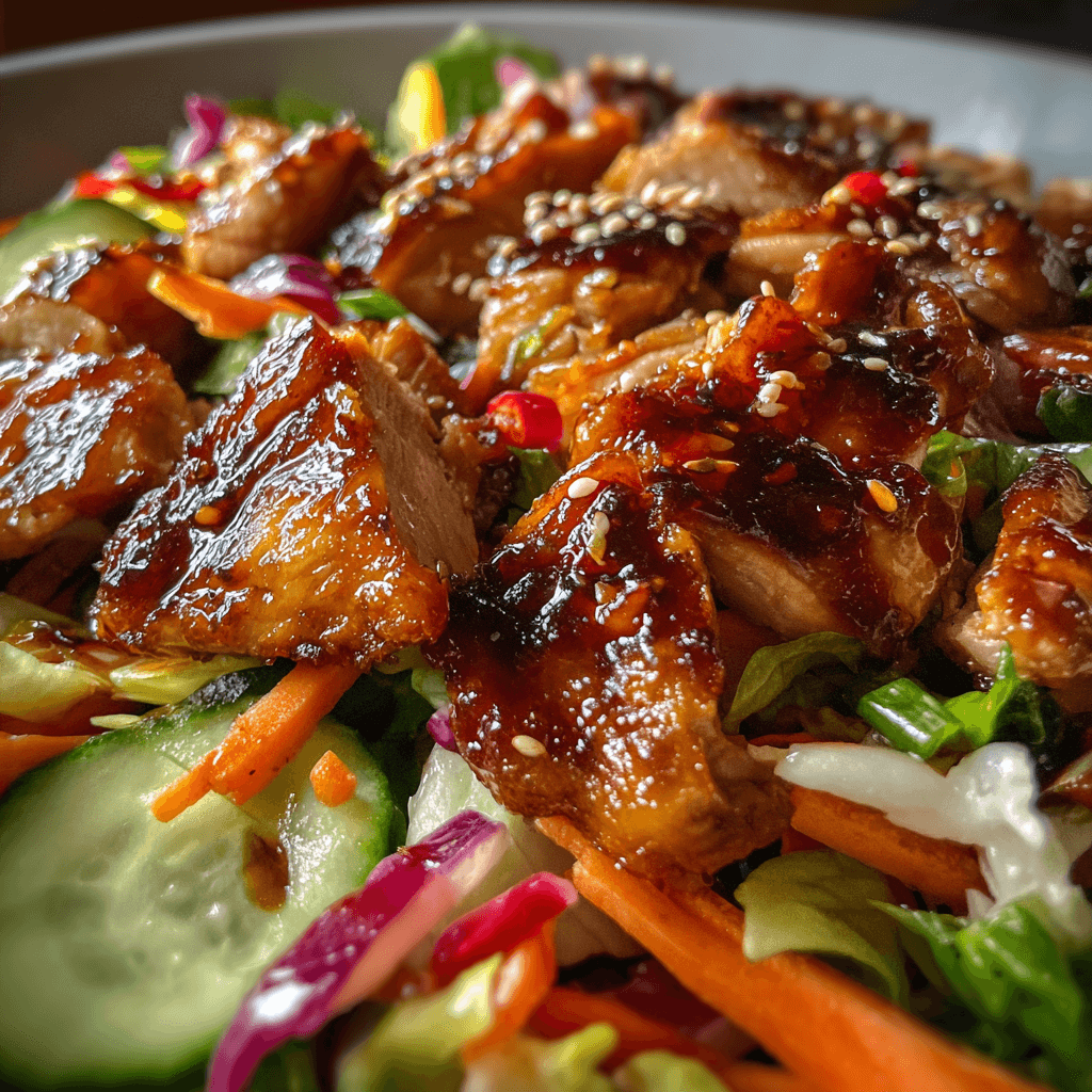 Teriyaki chicken salad made with tender chicken coated in a sweet soy glaze, served with crisp vegetables for a fresh and balanced meal. Perfect for lunch, dinner, or meal prep.